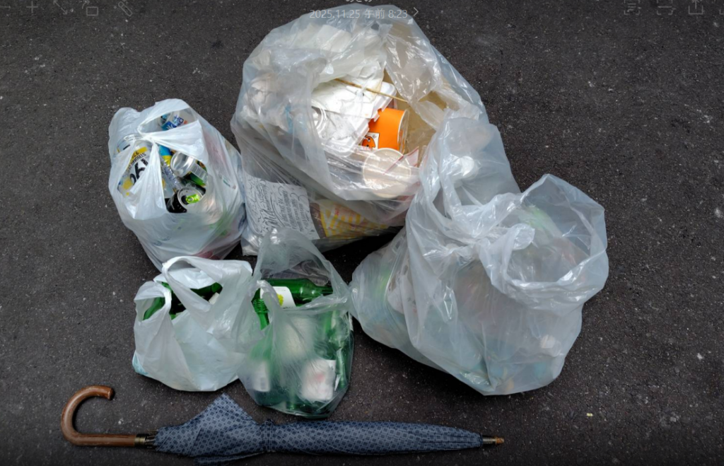 公園通りでは、可燃ゴミ 90L、缶 45L、ペットボトル 45L、缶 45L、ビン 2本、傘 2本 を回収しました。