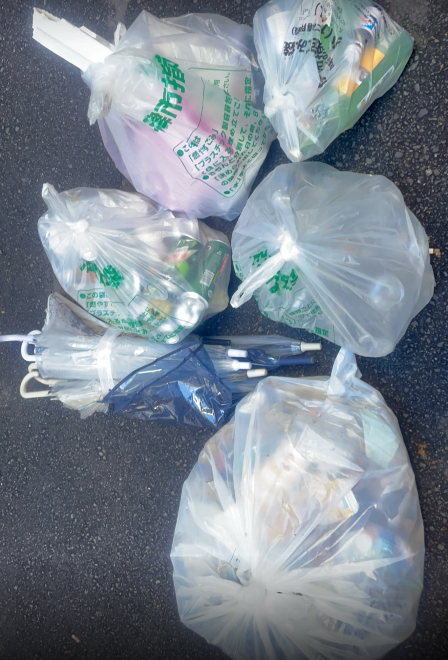 一方、公園通りでは、可燃ゴミ130L、缶45L、ペットボトル45L、ビン10本、傘6本を回収し、センター街に比べてゴミの量がかなり多い結果となりました。特に傘の不法投棄が目立ち、改善が求められます。