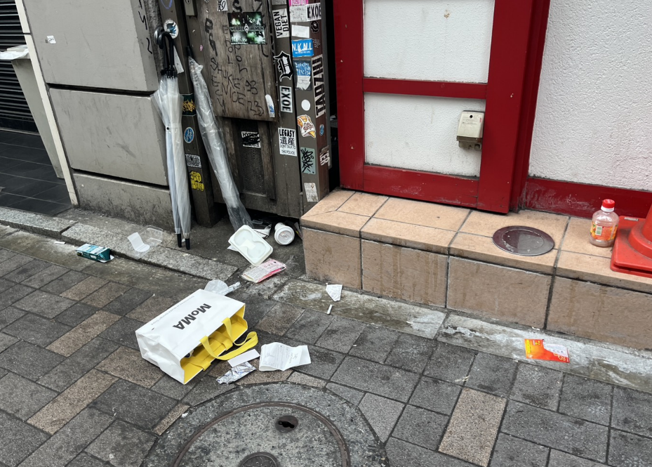 センター街の状況:ショップ袋の散乱 センター街では、買い物の後のショップ袋がそのまま捨てられているケースが目立ちました。綺麗な袋も、道に捨てられれば街を汚すゴミになってしまいます。