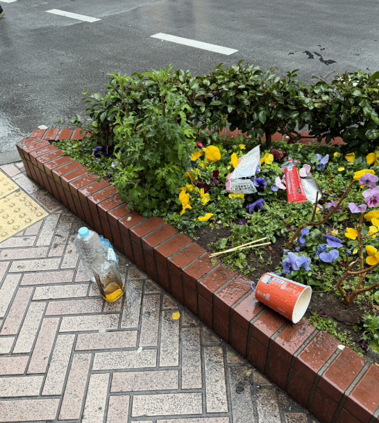 「花壇」はゴミ箱ではありません 今日、センター街で見かけたのは、花壇の中にポイ捨てされたカップ麺の容器です。春に向けて準備をしている花たちが、ゴミに埋もれている姿を見るのはとても心苦しいものです。