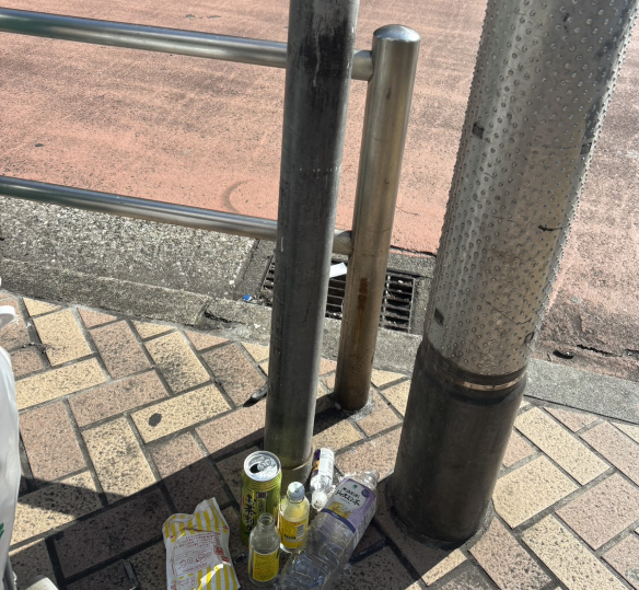 お酒のゴミがまとめて袋に入れられ、道端に置き去りにされていました。