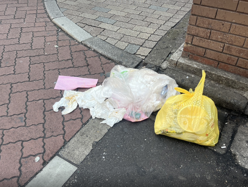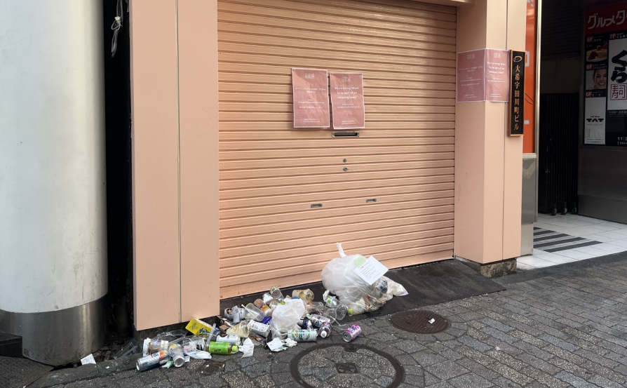 今日のセンター街で困ってしまったのが、「集積所ではない場所」に、まるで申し合わせたかのように固まって捨てられていたゴミたちです。