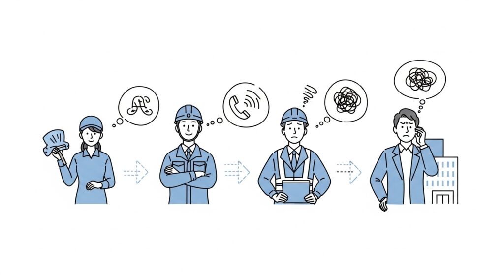 この構造の中で起きやすいのが、「情報の遅れ」と「現場との距離」です。オーナーが清掃時の状況を確認しても、実際に作業しているのは孫請けのスタッフであることも多く、正確な情報を得るまでに時間がかかる。さらに伝言の過程でニュアンスが抜け落ち、現場の実態が見えにくくなることもあります。